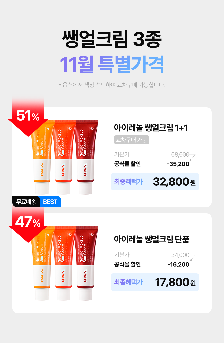 아이레놀 쌩얼 크림 3종 50ml [SPF 50+ PA++++]
